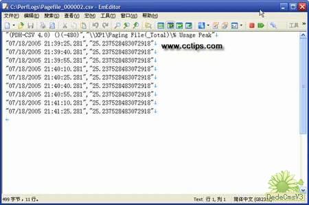 这时你需要先停止这个记数器的运行,同样是在记数器日志窗口中,选中我们新建的Page File记数器,然后右键点击,并且选择停止。用记事本打开日志文件,你看到的结果应该跟图六类似。我们根据这幅图一起来分析一下分页文件的使用。