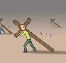 第一幅漫画中,每个人都背负着一个沉重的十字架,在缓慢而艰难地前行!